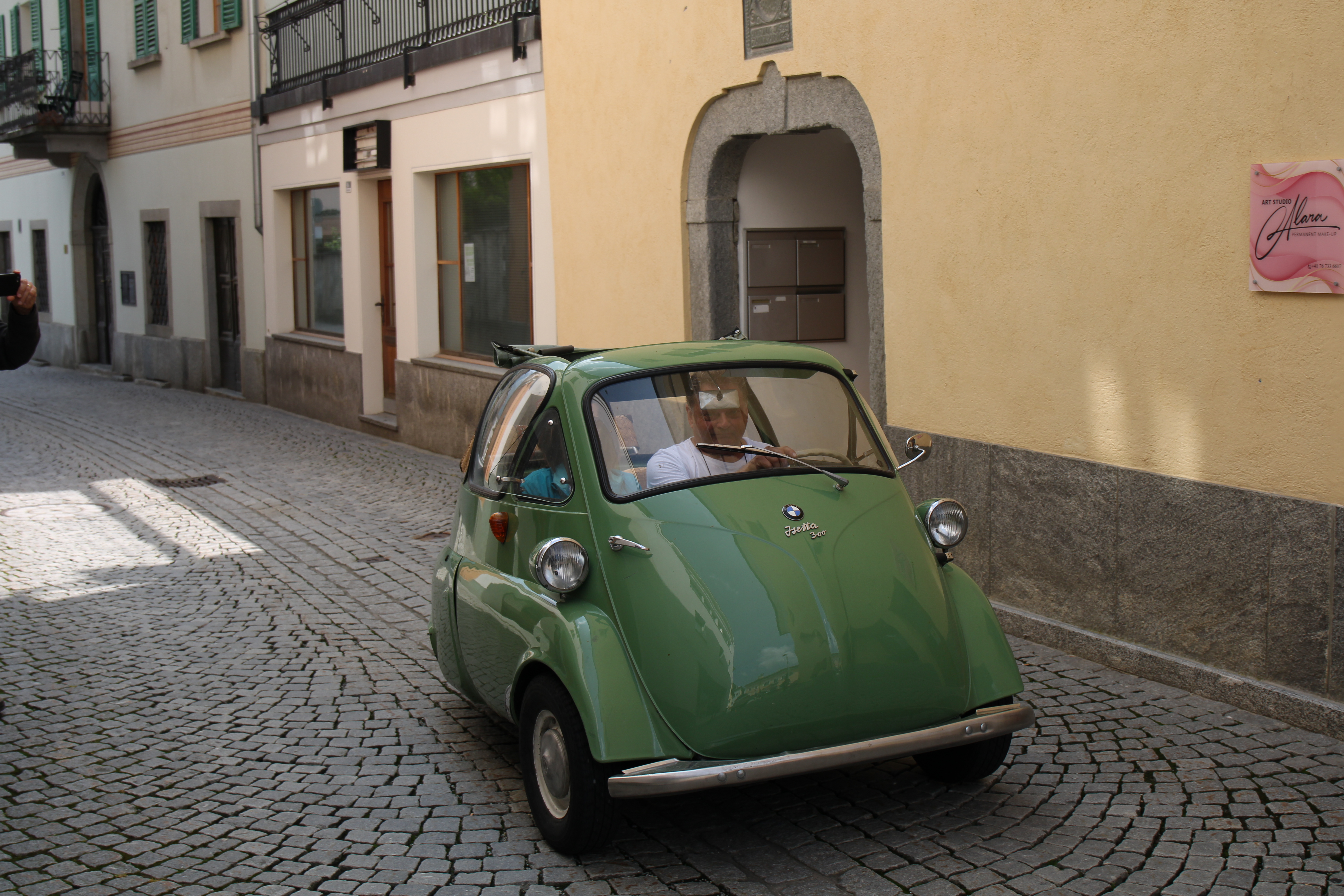 In Poschiavo, we get a sneak peek at the BMW museum with a guy driving around in an Isetta in beautiful condition